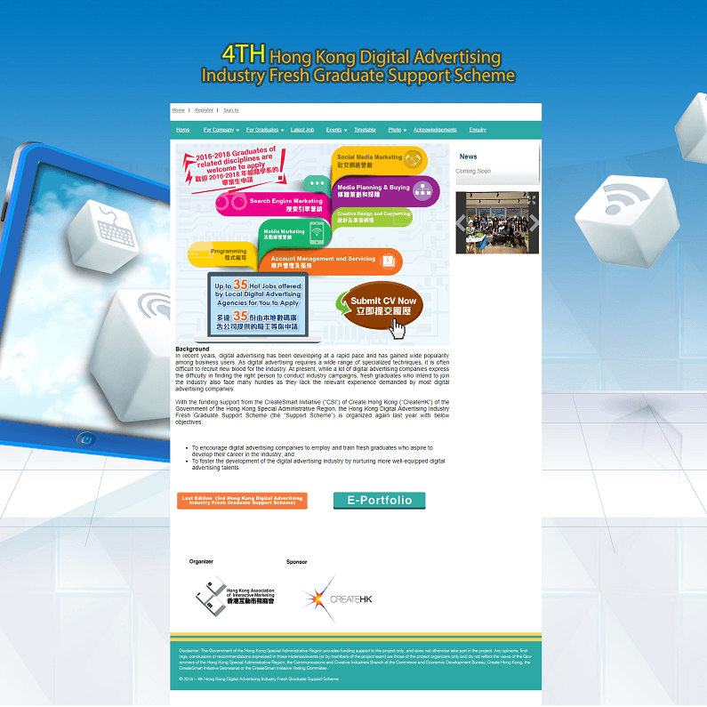 A new job website is developed for the 4th Hong Kong Digital Advertising Industry Fresh Graduate Support Scheme which aims to encourage digital advertising companies to employ and train fresh graduates who aspire to develop their career in the industry.